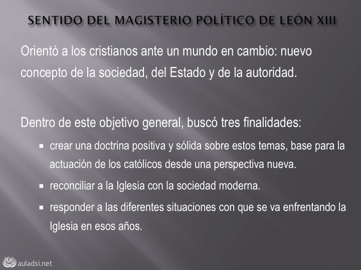 El sentido del magisterio político del Papa León XIII  orientó a los cristianos ante un mundo en cambio, ante un nuevo concepto de la sociedad, del Estado y de la autoridad.