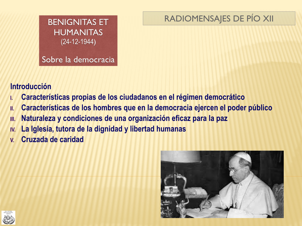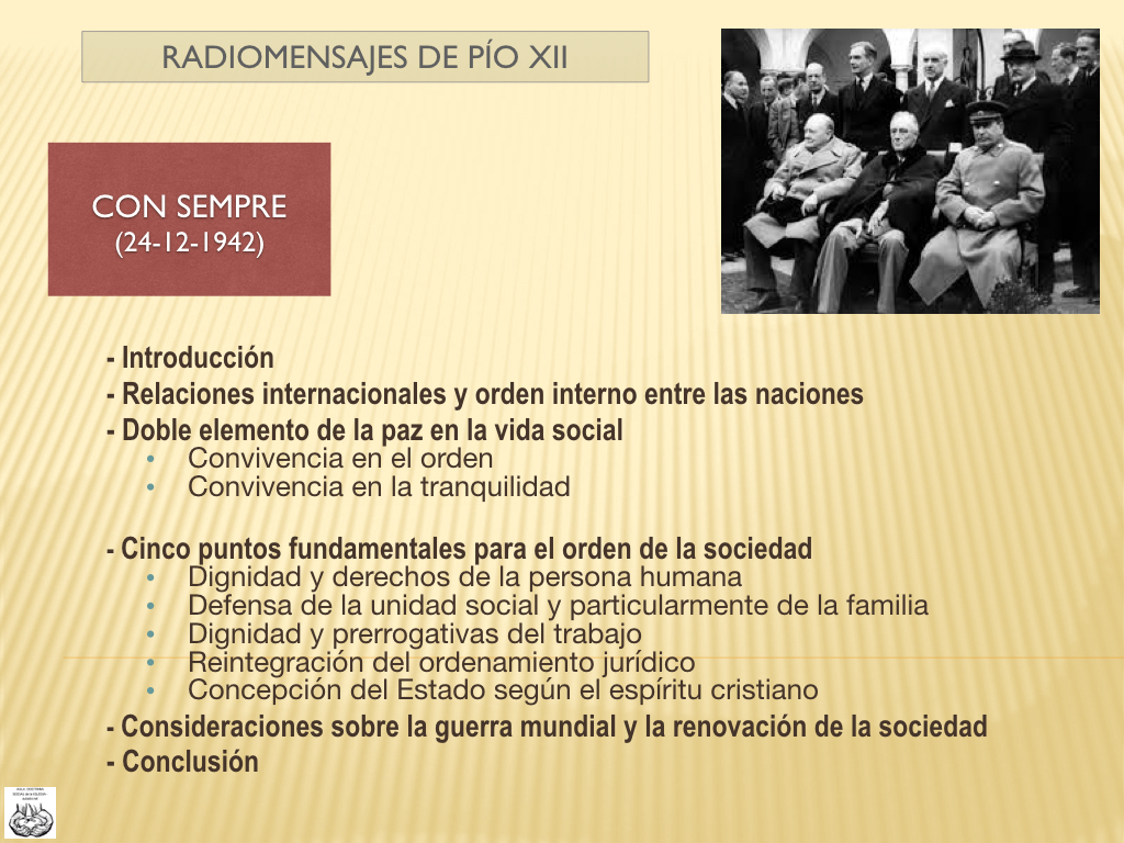 (Recorrido de la Doctrina Social de la Iglesia). La enseñanza de la Doctrina Social de la Iglesia de Pio XII se plasmó en Discursos (p.e.: La Solennitá) y Radiomensajes (p.e.: In questo giorno, Grazie, Nell´alba, Con siempre…) y no en encíclicas. Eso le obligó a una mayor concisión. Pero no limitó en absoluto su temática tanto en el magisterio social como al político.